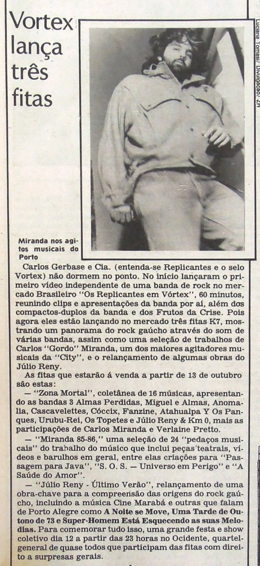 Carlos Gerbase e Cia. (entenda-se Replicantes e o selo Vortex) não dormem no ponto. No inicio lançaram o primeiro vídeo independente de uma banda de rock no mercado Brasileiro “Os Replicantes em Vortex”, 60 minutos, reunindo clips e apresentações da banda por ai, além das compactos-duplos da banda e dos Frutos da Crise. Pois agora eles estão lançando no mercado três fitas K7, mostrando um panorama do rock gaúcho através do som de varias bandas, assim como uma seleção de trabalhos de Carlos “Gordo” Miranda, um dos maiores agitadores musicais da “City”, e o relançamento de algumas obras do Júlio Reny.