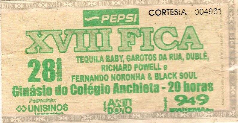 Ingresso para o XIII Festival Anchietano da Canção (FAC) e o Festival Interno da Canção Anchietana (FICA), evento este que era um ‘concurso’ de Bandas de alunos do Colégio Anchieta, em Porto Alegre – RS.